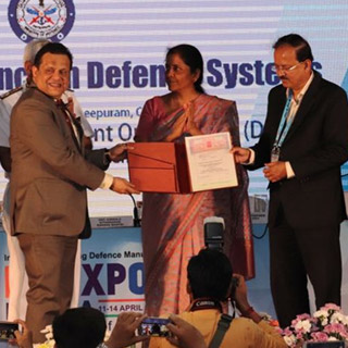 Receiving T.O.T for Technology Transfer Agreement from DRDO at the hands of then Raksha Mantri, Smt Nirmala Sitharaman at DefExpo April 2018.